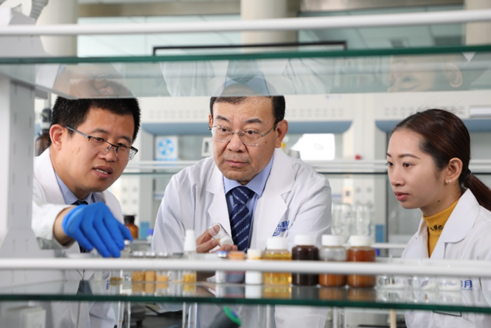 2021年3月,中國科學(xué)院大連化物研究所研究員馬小軍博士(中)在明月海藻集團(tuán)國重實驗室