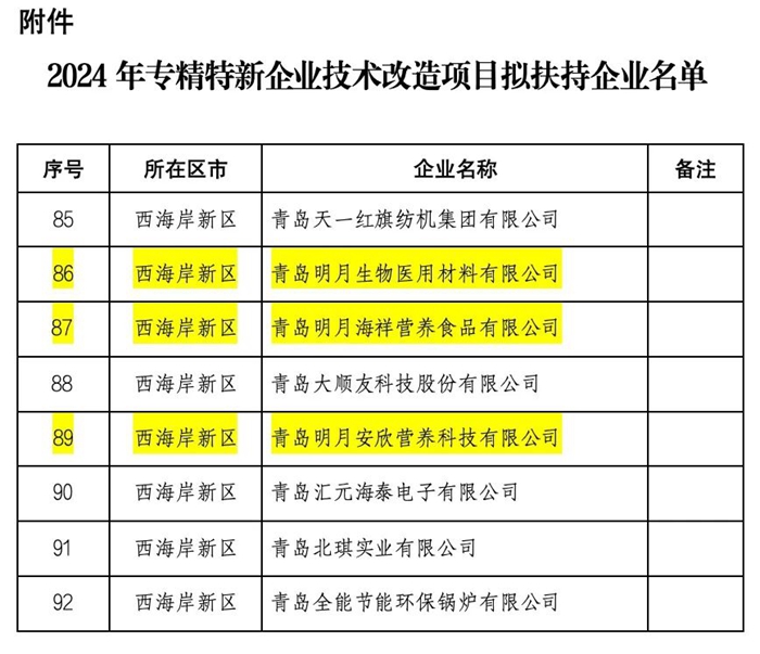 近日,市民營經濟局公示了青島市2024年專精特新企業技術改造項目扶持企業名單。青島明月海藻集團旗下的青島明月生物醫用材料有限公司、青島明月海祥營養食品有限公司、青島明月安欣營養科技有限公司均成功獲批,3家公司獲批總金額超200萬元。