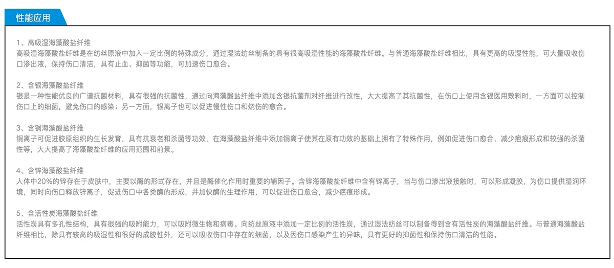 在普通海藻酸鹽纖維生產(chǎn)工藝的基礎(chǔ)上,通過(guò)向紡絲原液中添加各種活性成分,包括銀、銅、鋅、活性炭等,以達(dá)到對(duì)海藻酸鹽纖維改性的目的,提高了其各項(xiàng)性能指標(biāo),具有更廣闊的應(yīng)用前景和更優(yōu)異的護(hù)理效果。
